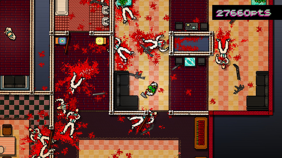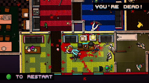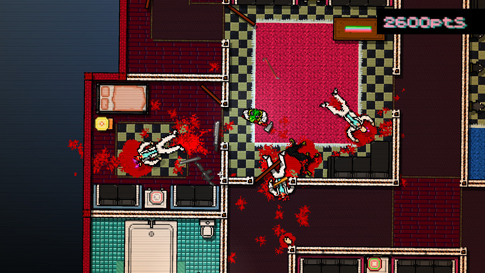 The level of ambiguity in the narrative serves the game extremely well. It is a relatively short game and you pick up most of the story from voices on your answering machine, brief dialog between missions, and environmental cues. The game controls are simple, intuitive, and are quite reliable in the frantic situations that you often find yourself in. Jacket uses a variety of weapons to murder everyone in his path; you will find plenty of guns, melee weapons, and thrown weapons to satisfy your bloodlust. Speaking of blood, there is a lot of it. A LOT. Sure it is low-rez pixilated blood, but that doesn't take away from how gruesome the game is.